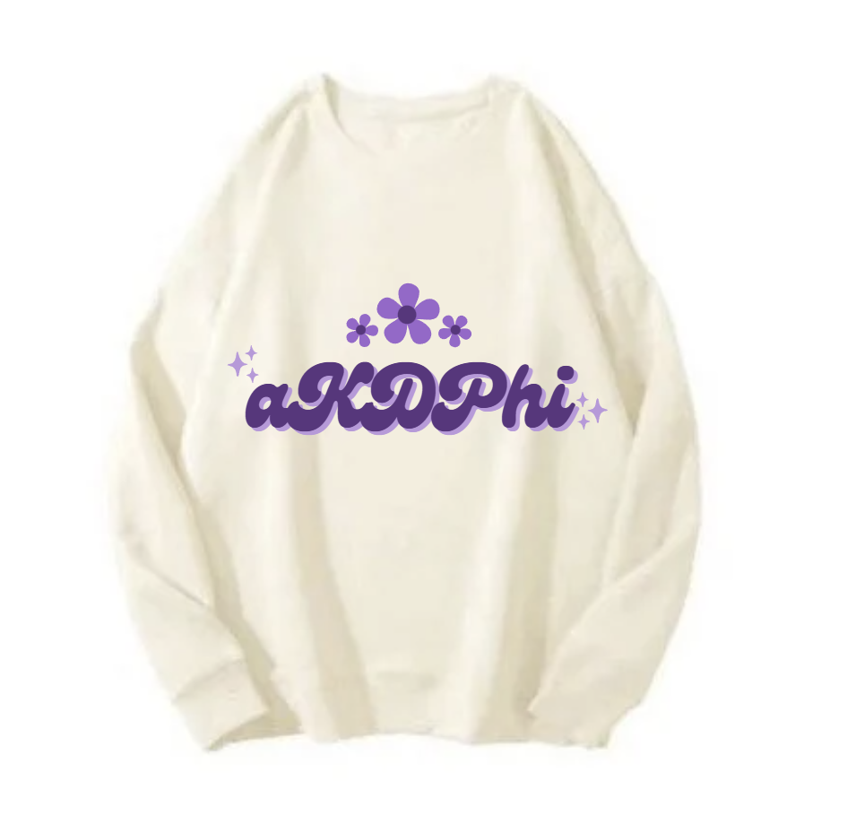 This cozy cream-colored aKDphi sweatshirt is the perfect blend of comfort and sisterhood pride. Featuring bold purple letters at the center, complemented by delicate floral motifs and subtle sparkles, it beautifully showcases aKDphi’s signature style. The minimalist aKDPhi text above the logo adds a polished touch, while the soft fabric and relaxed fit make it ideal for everyday wear. Celebrate your sisterhood in style with this elegant and meaningful design!